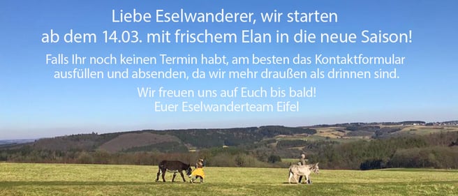 "Ich bin dann mal weg". Hier findest Du keinen Jakobsweg, aber eine gut ausgebaute Geschichtsstraße durch Wälder, Wiesen und Natur-Pur in der wunderschönen Eifel. Mach einfach mal einen Stopp vom Alltag, halte ein paar Stunden die Zeit an und wandere gemütlich mit unseren Eseln los - ohne vorher im Trainingslager gewesen zu sein.